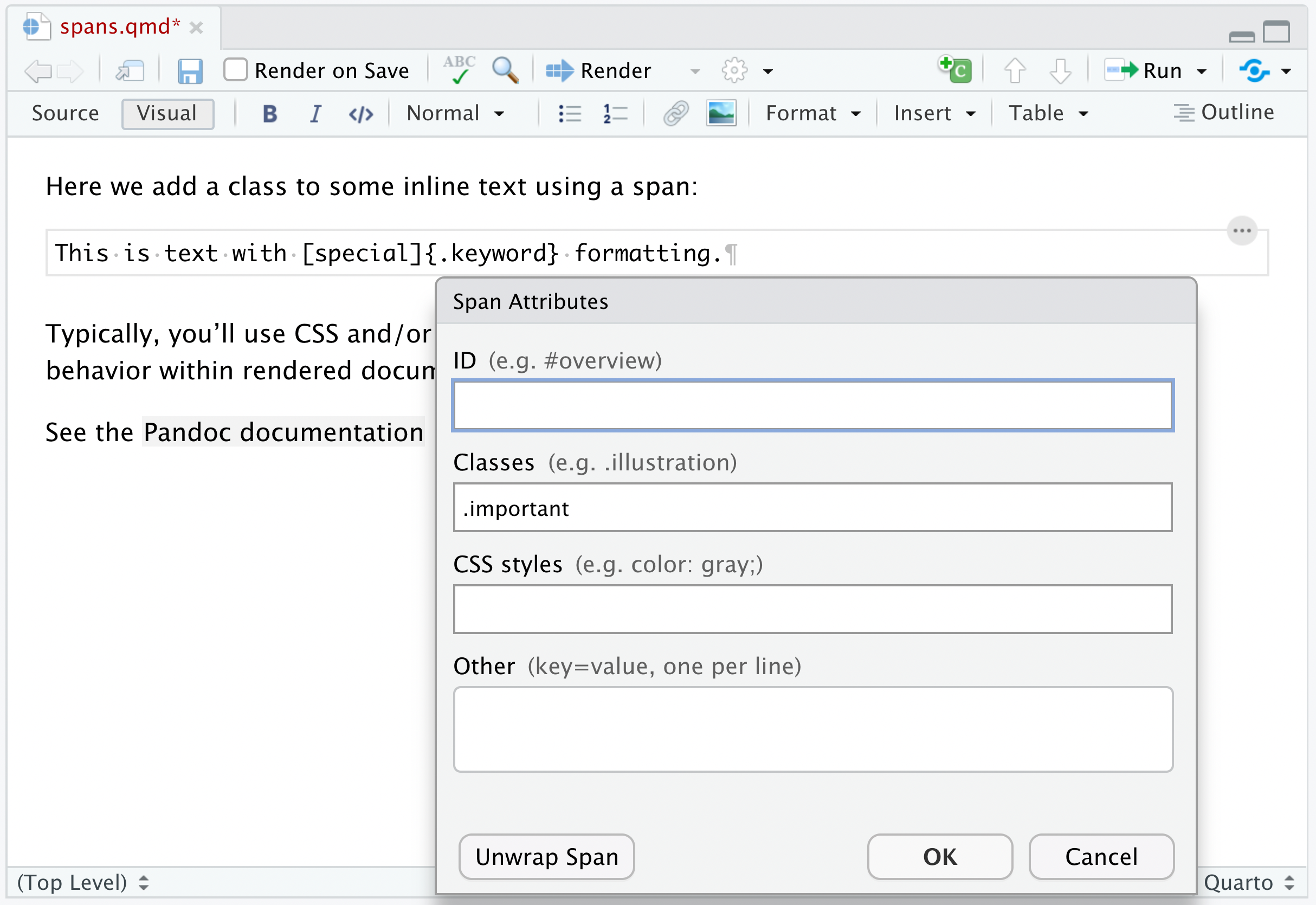 Visual mode supports editing all of Pandoc markdown. Standard formatting commands (headings, bold, italic, etc.) work just the way they do in a conventional word processor.