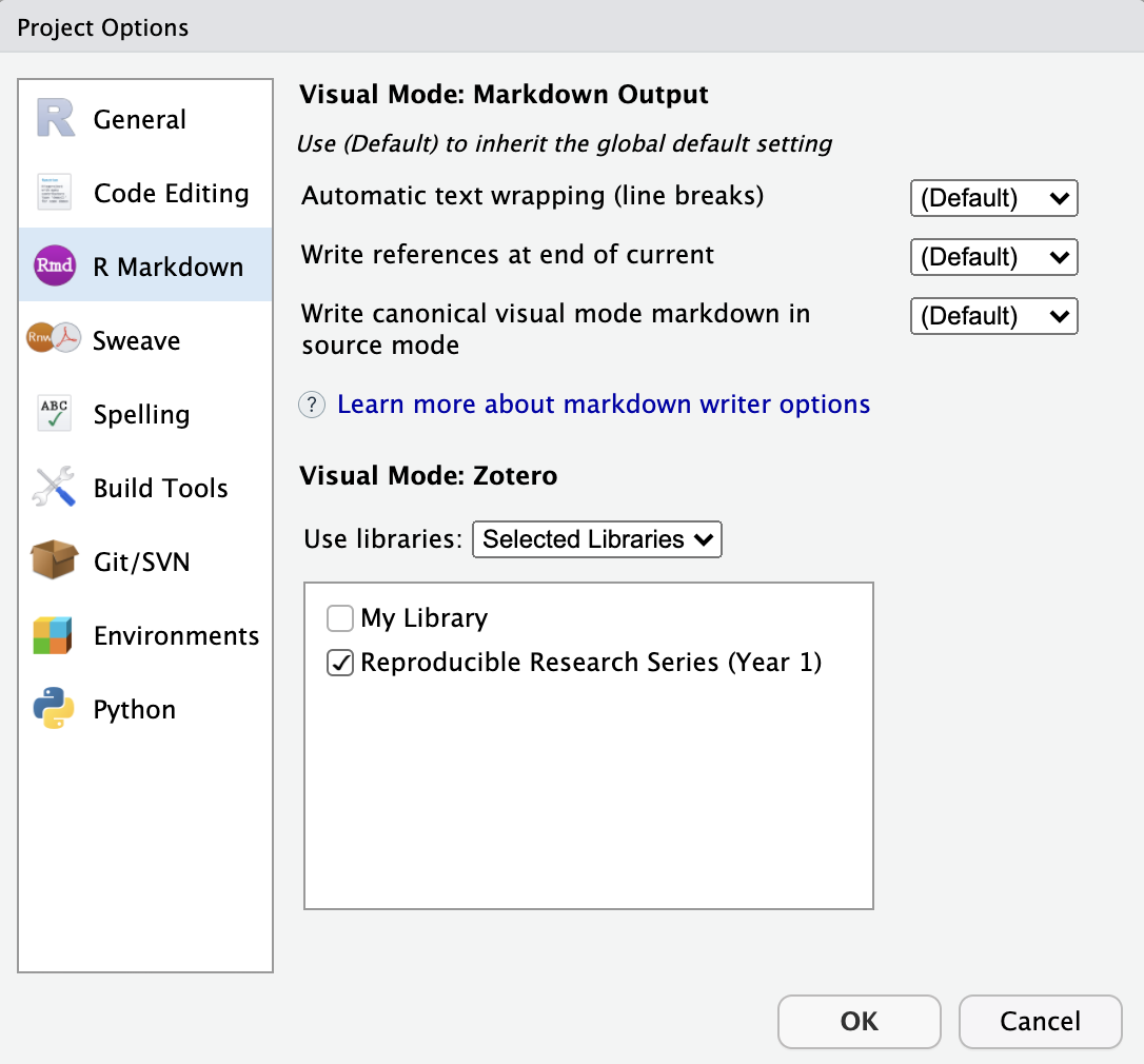 For example, here we specify a project-level option to use the Reproducible Research Series (Year 1) group library: