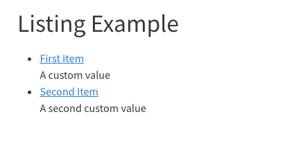 When rendered, the above template will receive an array of listing items called items. When the contents of a listing are loaded from a list of documents, each of those items will be populated with the fields described in Listing Fields. In addition, any other fields included in a documents metadata will be passed as a property of the item, making it possible to use custom metadata in your documents and the listing display.